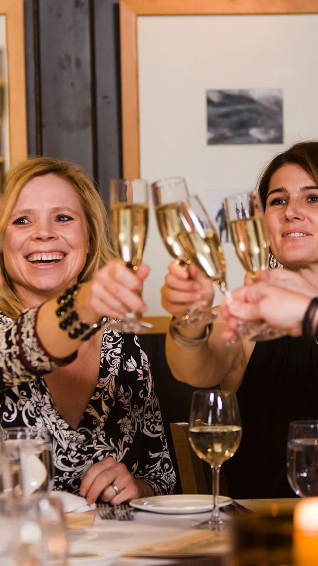 Private bar, mountain view and streetscape views, guests are seated at tables of 6-12.
