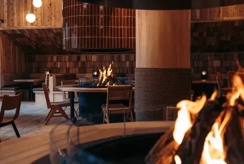 A warm and intimate private room with a fireplace, mountain views, and an inviting ambiance that will make you never want to leave.