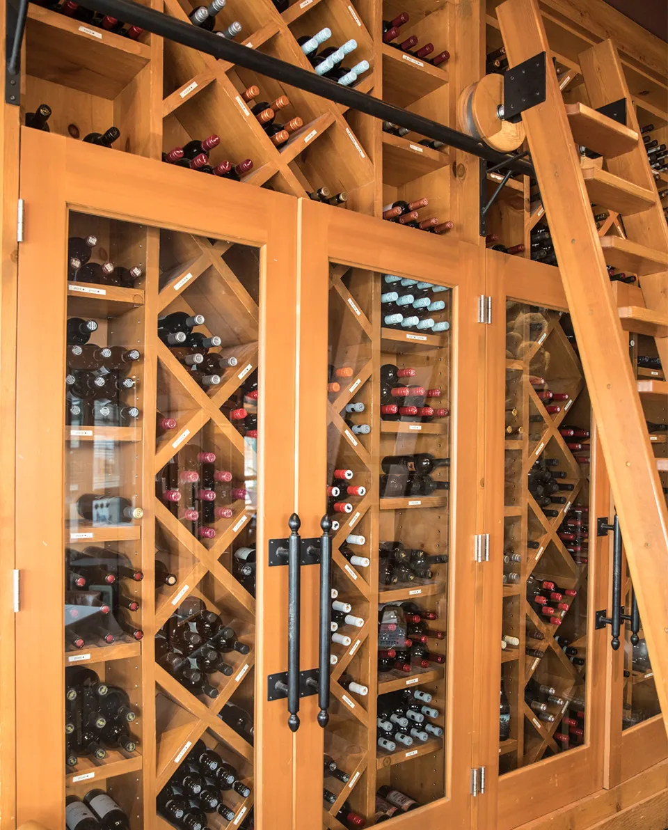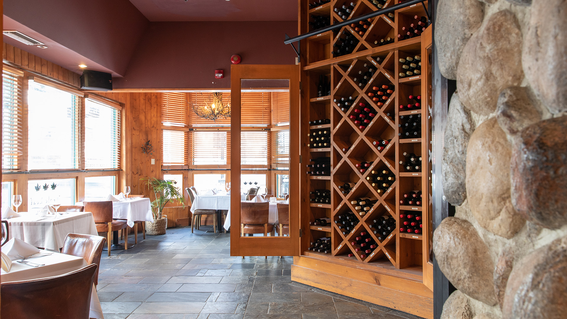 Our mid-sized private room located on the main floor of the restaurant features an impressive floor to ceiling wine display, classic antler chandeliers, lots of natural light and a sliding glass door. This warm room has space to enjoy a standing cocktail reception before sitting down for dinner at one long table.