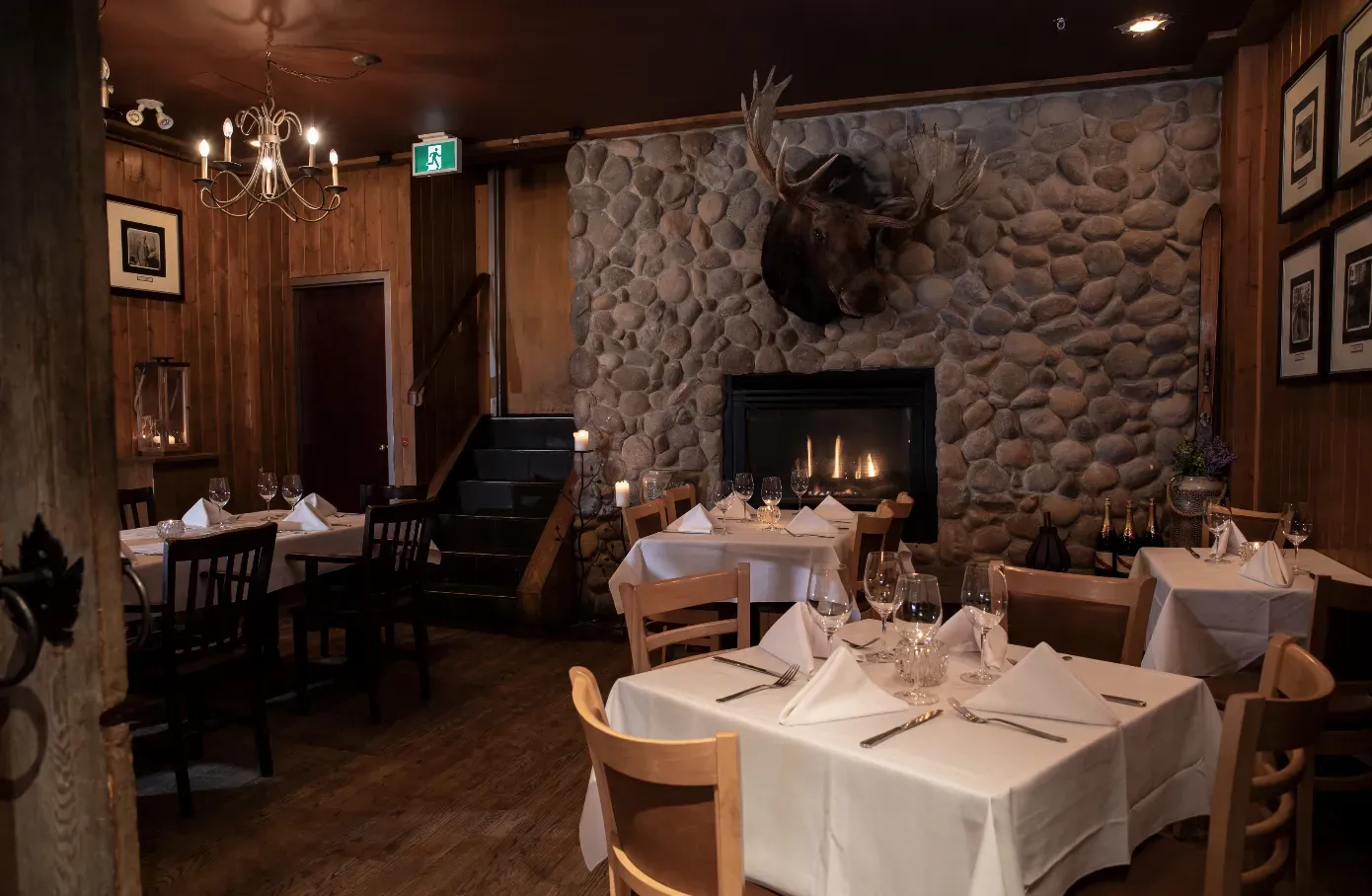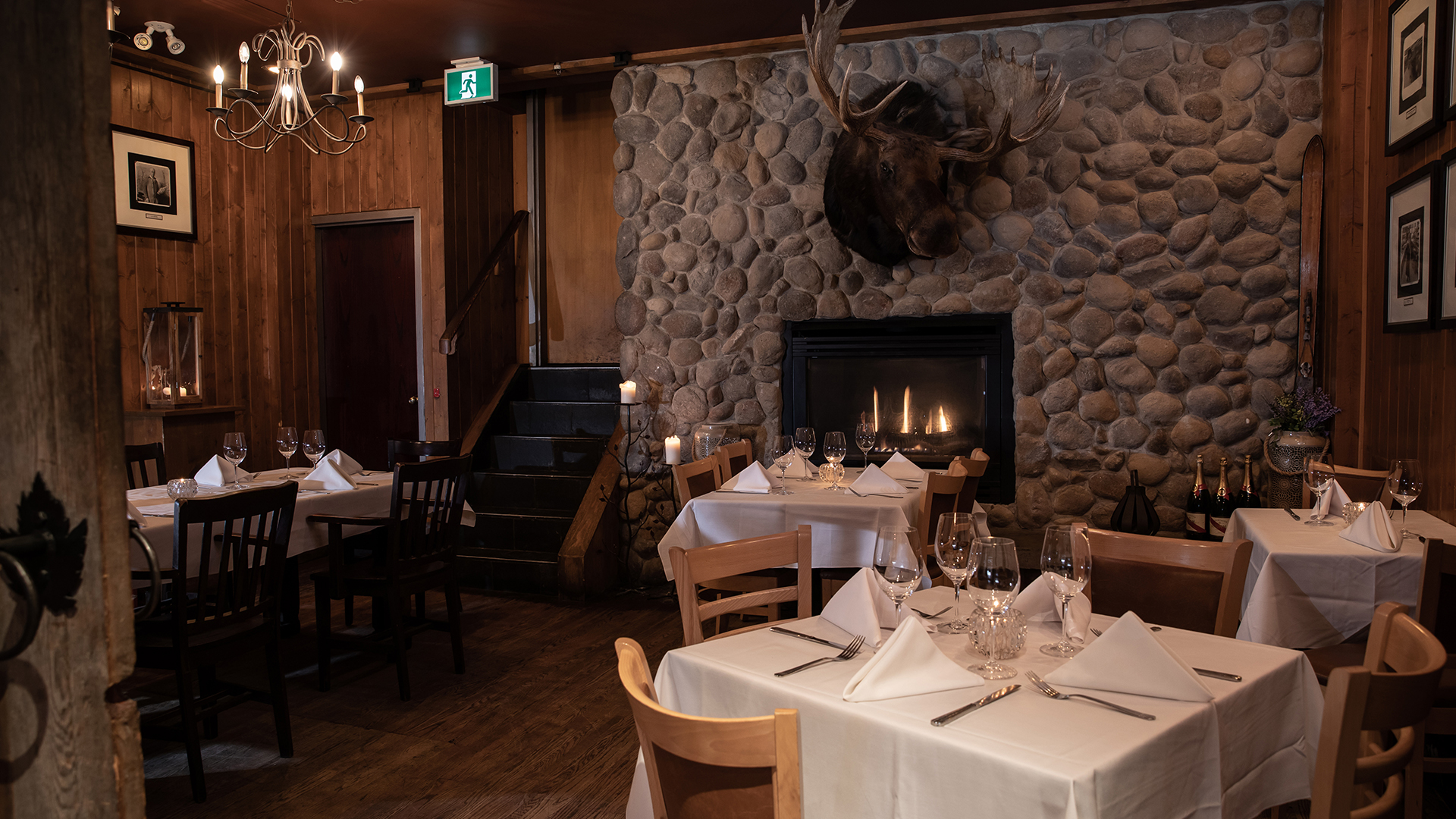Our Canadian-themed room located on the main floor of the restaurant features a large fireplace, an enormous moose head, and a sliding barn-wood door to ensure total privacy.