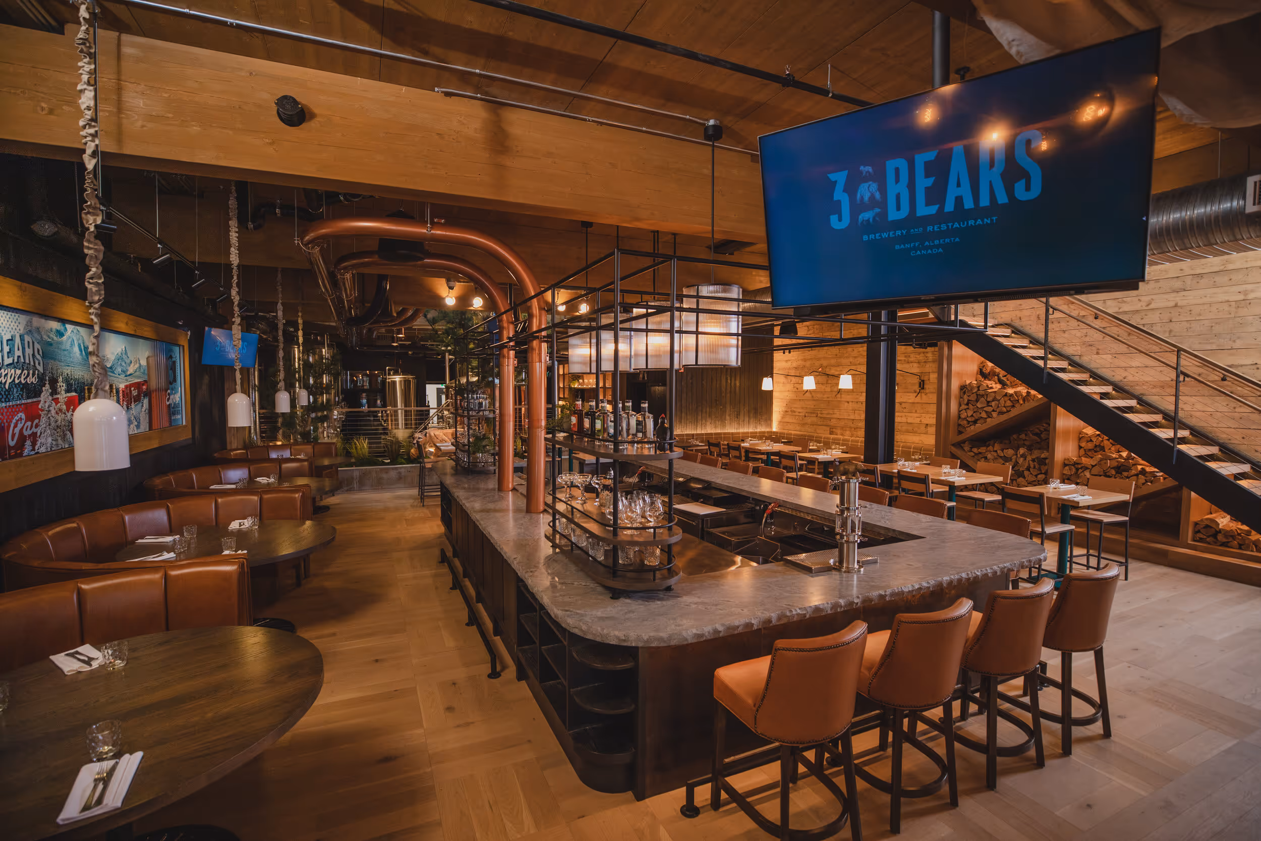 Three Bears Brewery & Restaurant, where the outdoors have been made yours right in the heart of downtown Banff National Park. At Three Bears we brought the outdoors in, with beautiful patios on all levels, thoughtful touches of flora and fauna throughout, and a retractable glass solarium roof that floods the upper level with beautiful light and sunshine. The bright interior highlights the tasteful salvaged barn wood walls and industrial elements that make the space polished and unique.