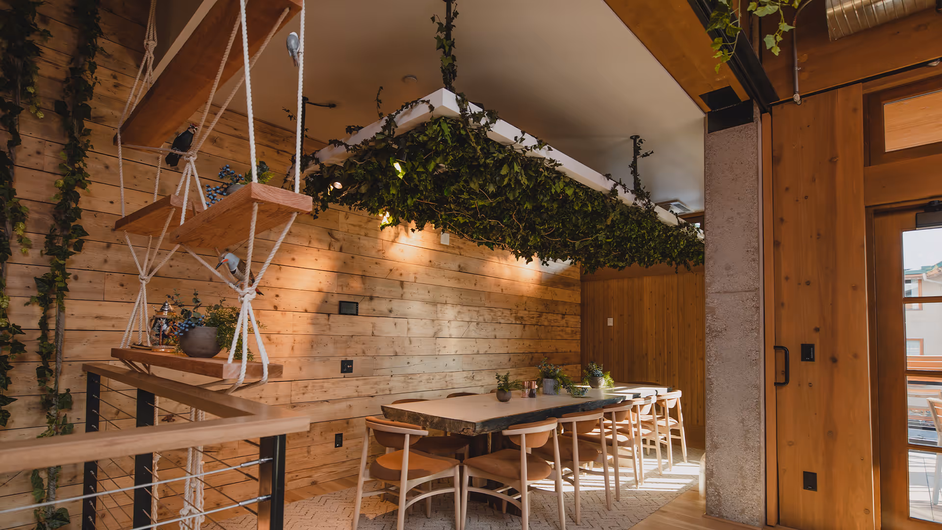 Sliding glass door to ensure for privacy, hanging plants, guests are seated at one large table.
