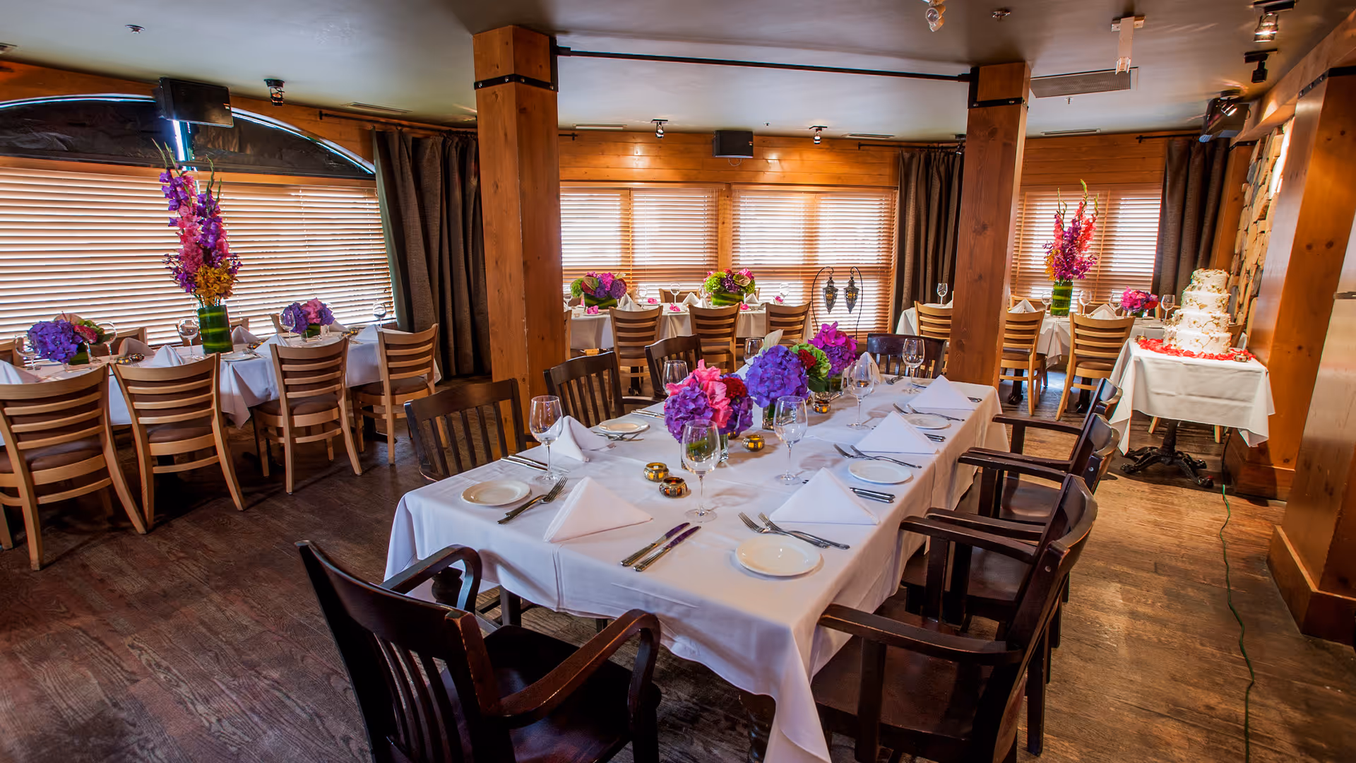 Private fireplace, a large-scale private bar, private washrooms, mountain views, AV capabilities, food stations for standing cocktail receptions, balcony overlooking lower level, dancefloor, velvet banquette seating. Guests are seated at long tables of 6-12.