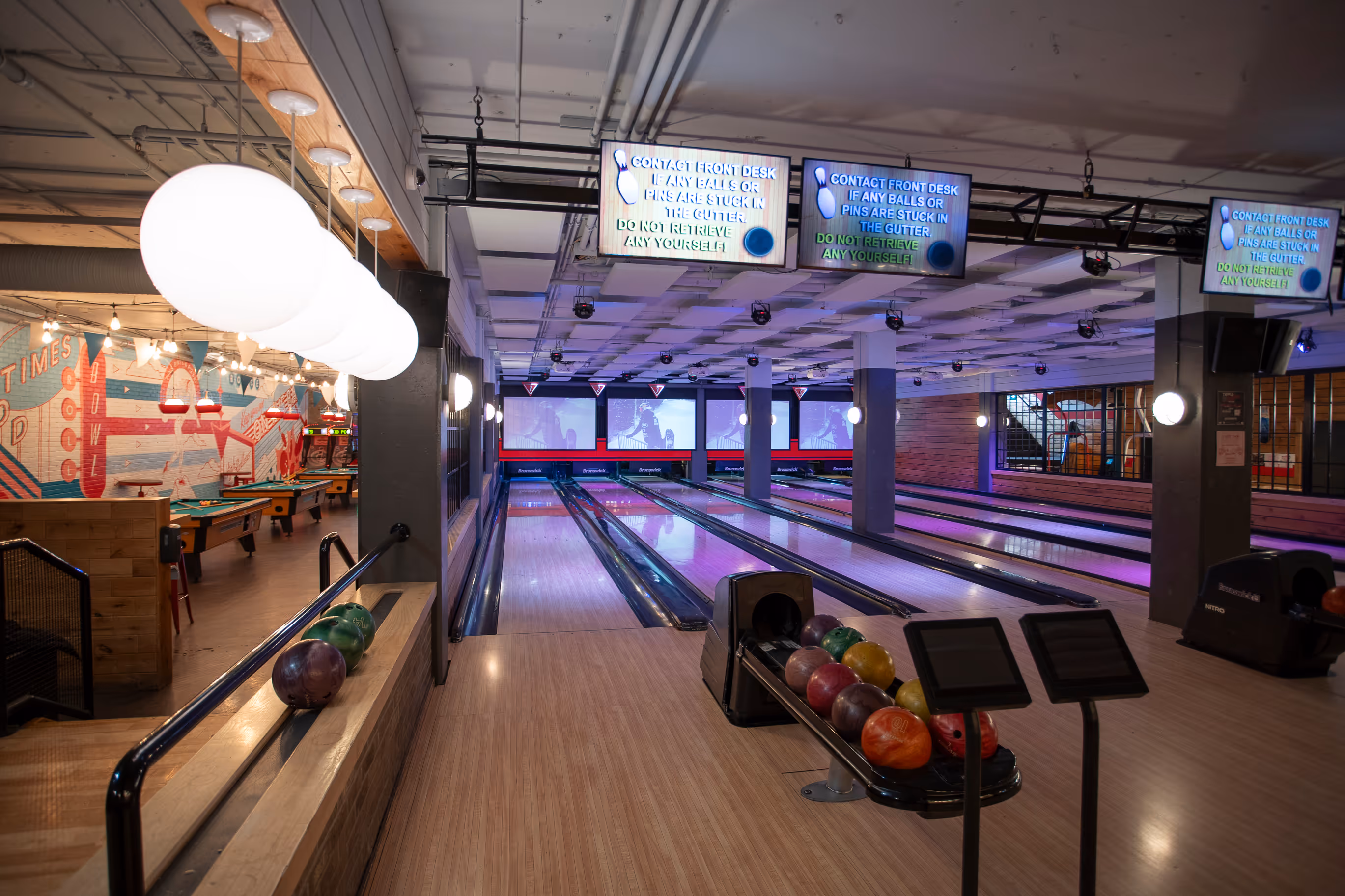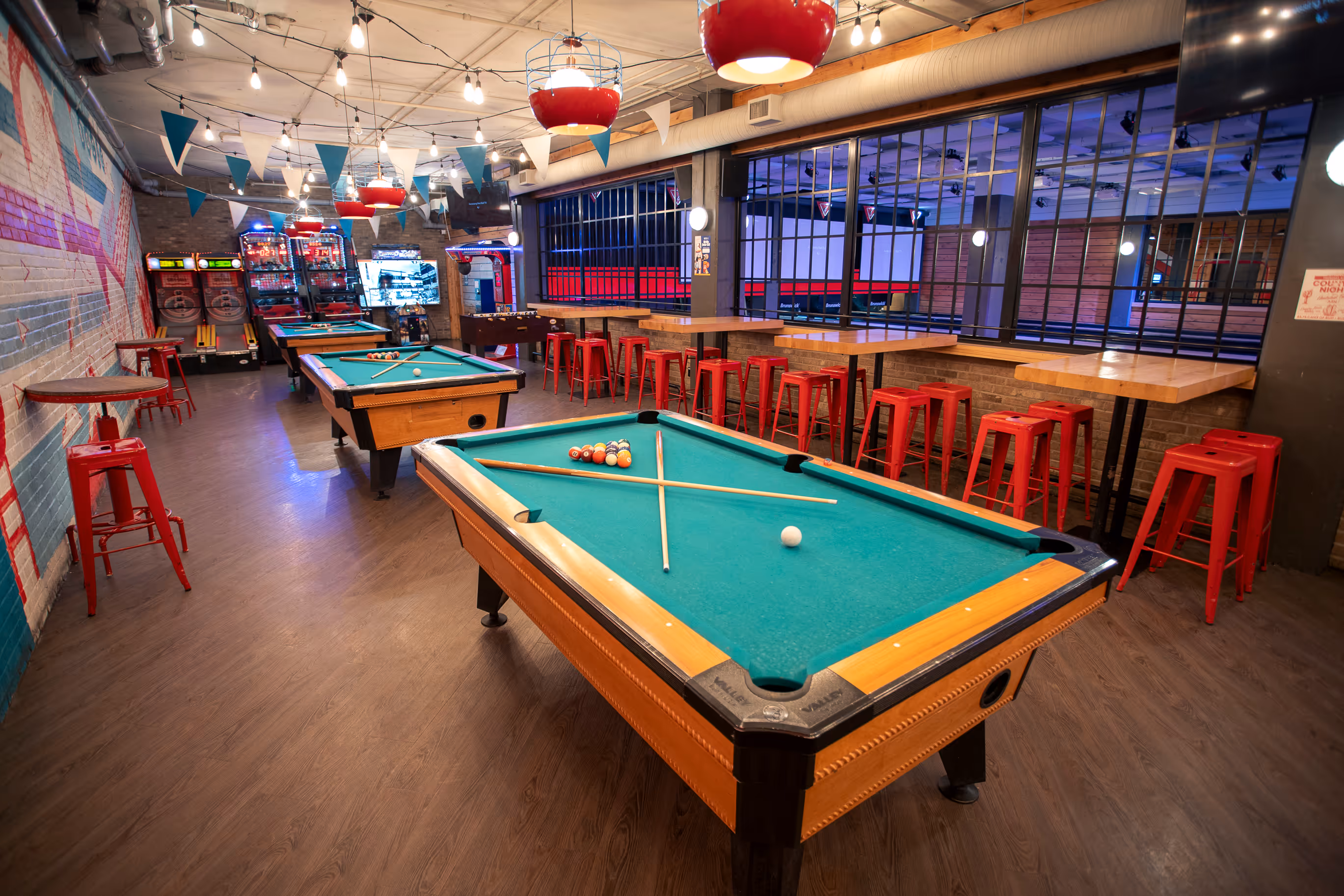 Introducing our semi-private premium space, combining the Billiards Hall and all six bowling lanes for the ultimate games and dinner experience! The bowling area features plush booths, side tables, multiple flat-screen TVs, and two large projection screens. The Billiards Hall boasts a private bar, stylish string lights, a vibrant wall mural, three complimentary pool tables, and coin-operated foosball.